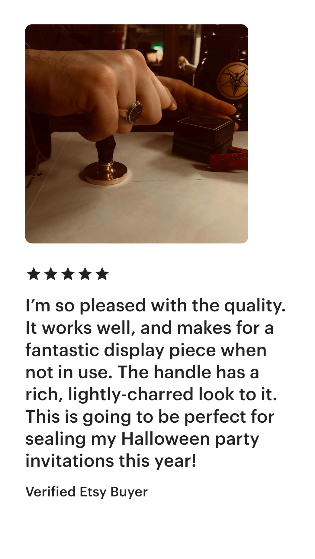 Great communication from the seller. The stamp itself is high quality and leaves a very nice impression. Came in a lovely velvet pouch and a couple wicked wax sticks. Thank you!